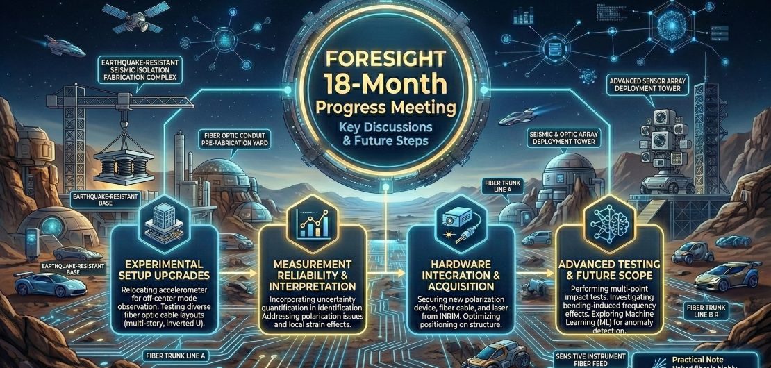 On 6 March 2026, the FORESIGHT Project held its 18-Month Progress Meeting at Politecnico di Milano to review the current status of the experimental activities, discuss technical challenges related to the fiber optic sensing setup, and define the next steps of the research. The meeting focused on improving the measurement configuration, enhancing data reliability, testing alternative sensor layouts, and strengthening the structural identification framework. The participants also reflected on the broader potential of the project outcomes to support more advanced data analysis and future damage detection approaches.